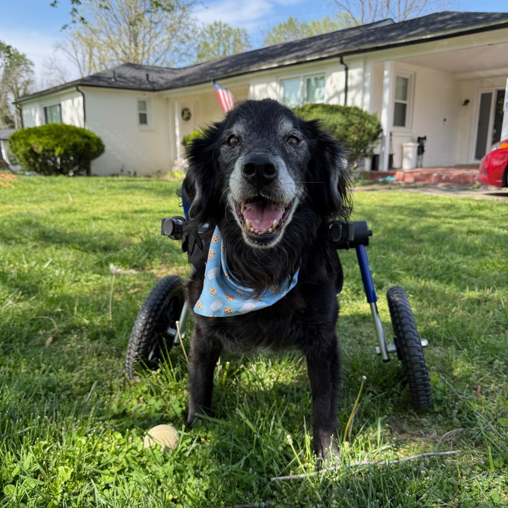 I always called Buster a "Cookie Monster", he never turned down a cookie (we called most treats cookies). In 2023 we released the Milk & Cookies single sided bandana. I put one on Buster it quickly became his "signature bandana". He wore his milk and cookies bandana everyday for almost 2 years, it was his favorite bandana. When stock got low on the milk and cookies bandana I had planned to bring it back and add another print to make it double sided. I sat on the idea for a while and when Buster passed it felt right to add a new print that also reminds us of him. As for the ladybug print, the day Buster passed there was a ladybug that crawled on him for over an hour and sat on his back as we had our last moments together. At this time I said "I think a ladybug will be his symbol." It felt fitting to make the new print a ladybug in Buster's signature blue color. Many dogs have a color and Blue was Buster's color. Every detail of this bandana was chosen because it holds a small detail of Buster. He is missed dearly and we hope our donation will help other dogs gain access to life changing mobility devices.
