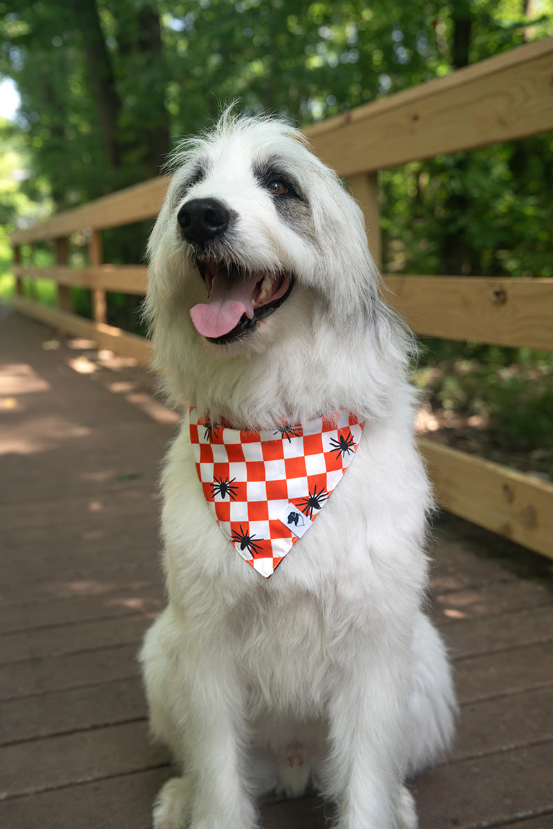 The Double Sided Halloween Dog Bandana is perfect for Fall. It's soft subtle print looks great on any dog breed. This bandana is available as a tie on style bandana in sizes small, medium, & large. For questions about sizing please reference our sizing chart.